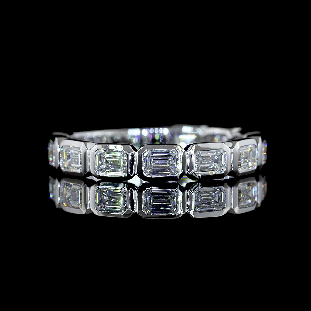 Crafted in 14k white gold, this 3/4 eternity band features 11 emerald-shaped diamonds, each with an east-west orientation. The bezel setting accentuates the crisp step facets and "hall-of-mirrors" flashes of the 0.13 carat center stones, creating a harmonious interplay of light. This piece balances elegance with comfort, making it an ideal choice for those who appreciate refined design details.